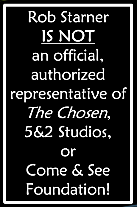 Second, in light of the above, it is important also to note that whereas the director of CrossLens Ministries, Dr. Rob Starner, actively promotes use of The Chosen in the Church and offers guidance to pastors and church leaders regarding the most effective and efficient ways to use The Chosen, NEVERTHELESS, Dr. Starner IS NEITHER an official representative of 5&2 Studios (formerly, The Chosen, LLC) NOR is he an official representative of its primary fundraising arm, the Come and See Foundation. There is NO ORGANIC CONNECTION between CrossLens Ministries (or its director, Dr. Rob Starner) and either 5&2 Studios or the Come and See Foundation. Dr. Starner is not being paid to represent or promote either of these organizations. His opinions and assessments and suggestions are strictly his own.